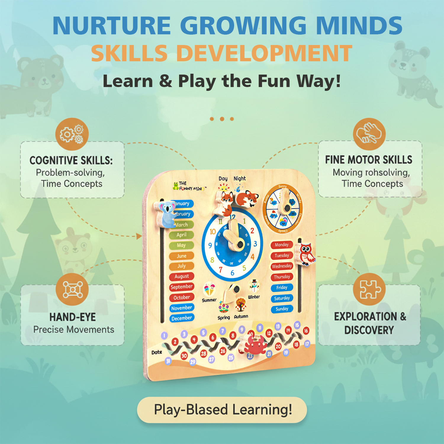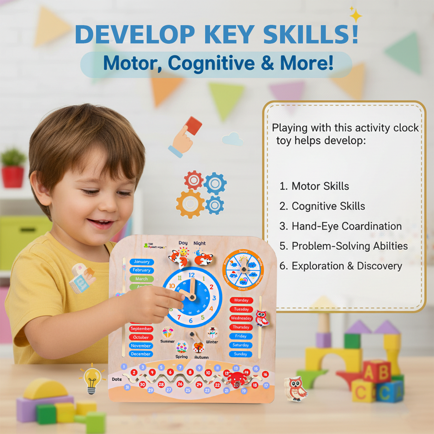 Motor and Cognitive Skills Development: Playing with this activity clock can help develop children's motor and cognitive skills, as well as their hand-eye coordination and problem-solving abilities. The clock encourages interactive play, allowing children to explore and discover at their own pace.