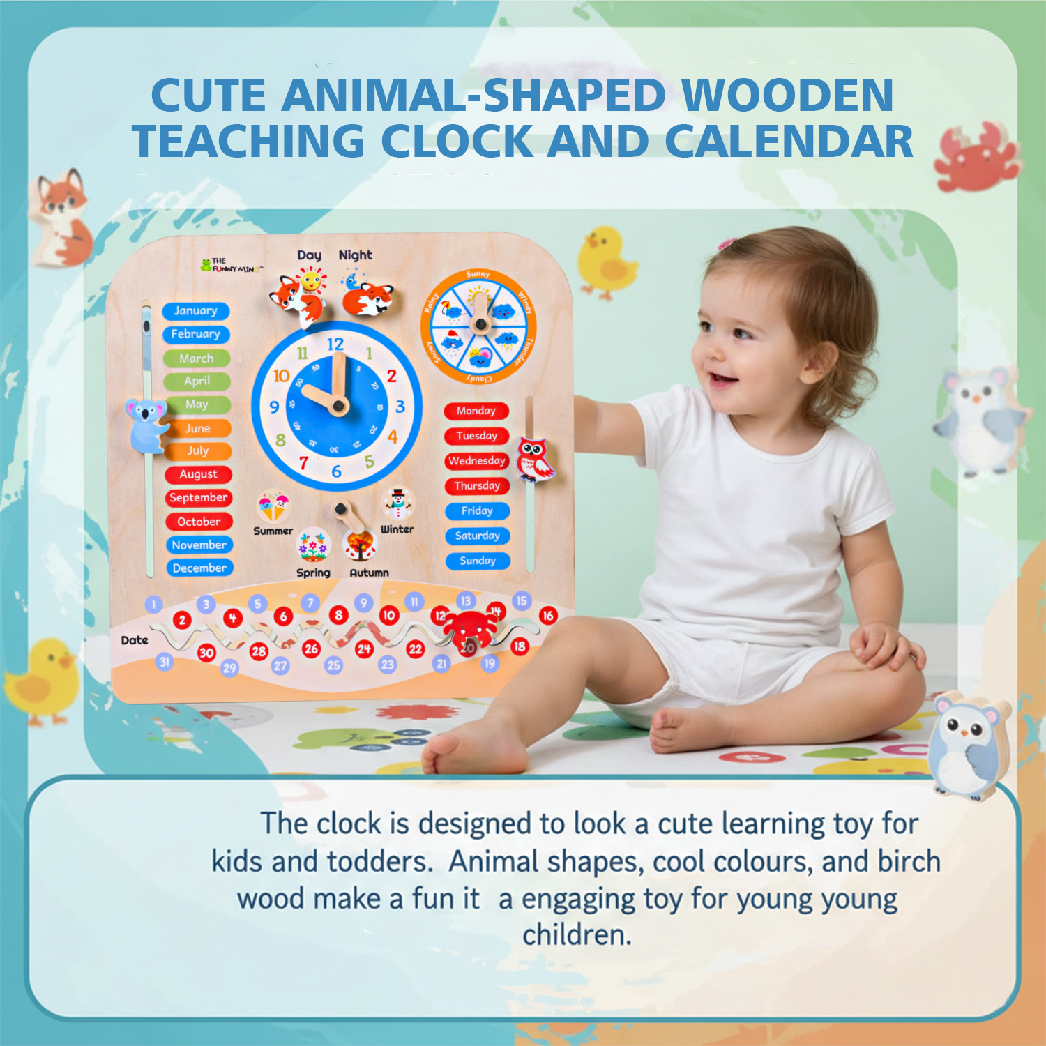 Cute Animal-Shaped Wooden Teaching Clock and Calendar: The clock is designed to look like a cute learning toy for kids and toddlers. Animal shapes, cool colors, and birch wood make it a fun and engaging toy for young children.